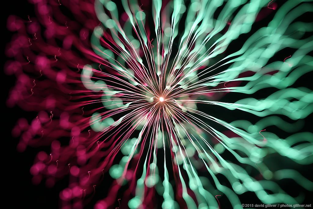 My lens choice for shooting fireworks had now changed: whereas previously I’d shot with wide (eg. 17mm or 24mm) lenses to capture the whole fireworks scene, now I was shooting with a telephoto lens around 100mm. I was deliberately placing myself as close to the fireworks as practical so that I could shoot up and ensure I didn’t get any background objects (buildings, etc) in the shot. The goal was to keep things abstract and weird.