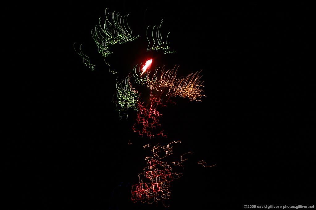 This meant that we only had a couple of minutes to rush off to setup for the fireworks. We didn’t have time to get out our tripods so we both sat down and attempted to hand-hold our cameras with as little movement as possible. As I was doing this (with only marginal success) it occurred to me: rather than fighting the unintended movement, what would happen if I added movement deliberately? Could breaking the conventional rule produce something interesting?