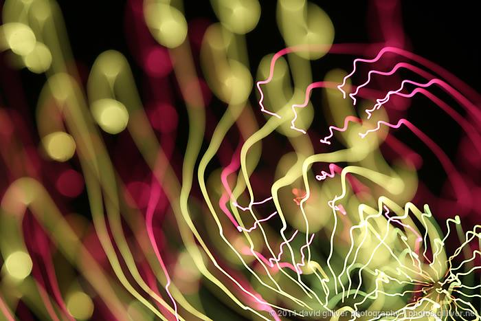 At subsequent fireworks events, I decided to try taking it further. I tried playing with the zoom dial during the exposure to give me light patterns streaking out from the centre. It then occurred to me that I could also play with the focus dial, starting the image in focus and turning it out of focus as the fireworks shell exploded. I later tried holding the focus ring steady while turning the camera, effectively changing the focus while creating a spiral effect.